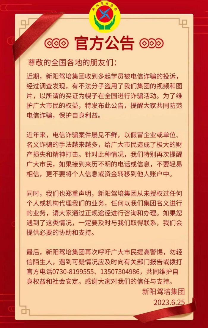 近期,新陽駕培集團收到多起學員被電信詐騙的投訴,經(jīng)過調(diào)查發(fā)現(xiàn),有不法分子盜用了我們集團的視頻和圖片,以所謂的買證為幌子在全國進行詐騙活動。為了維護廣大市民的權益,特發(fā)布此公告,提醒大家共同防范電信詐騙,保護自身利益。